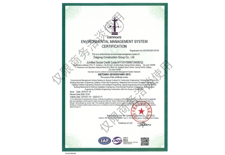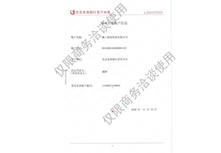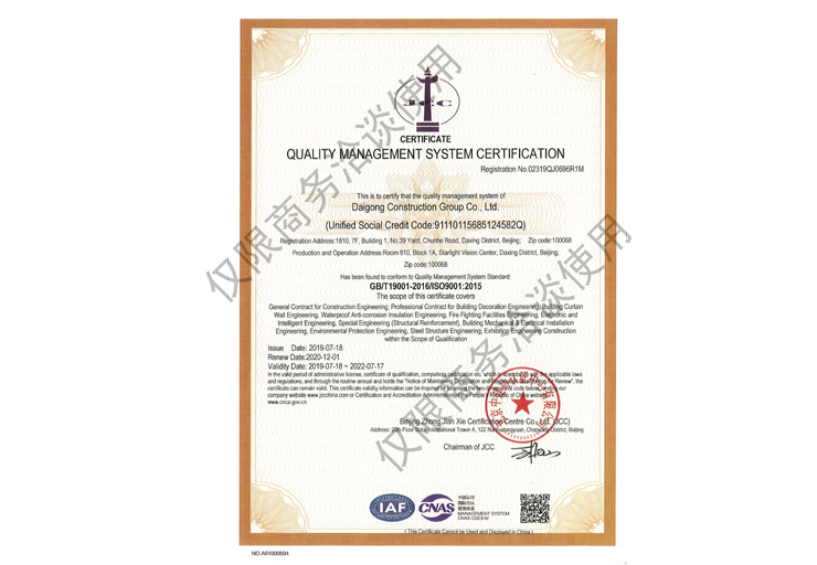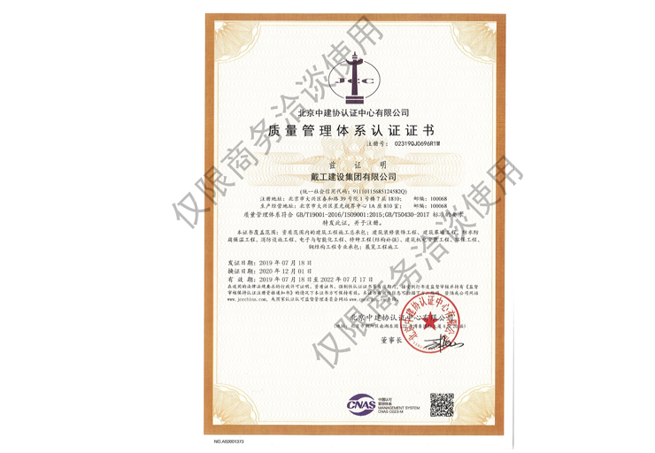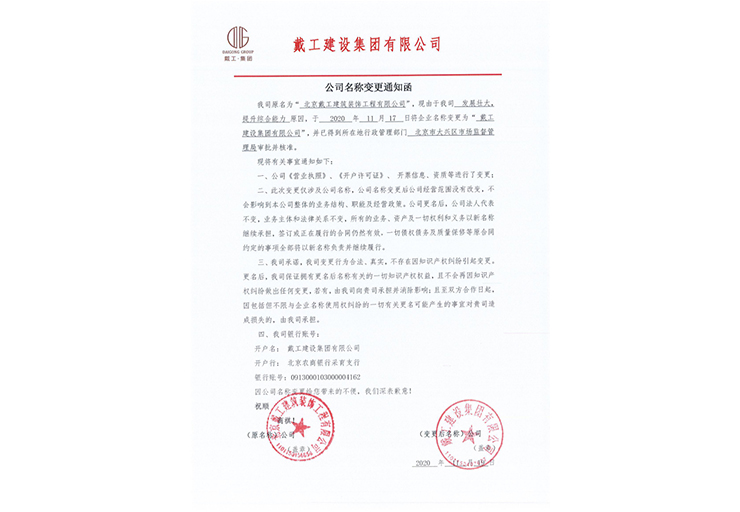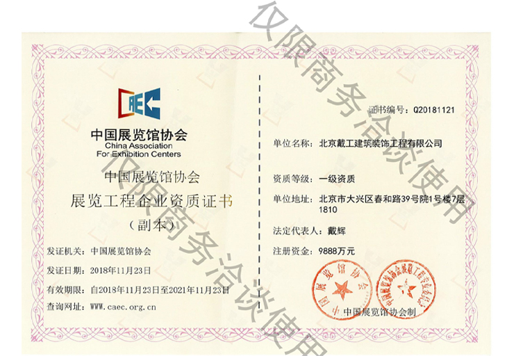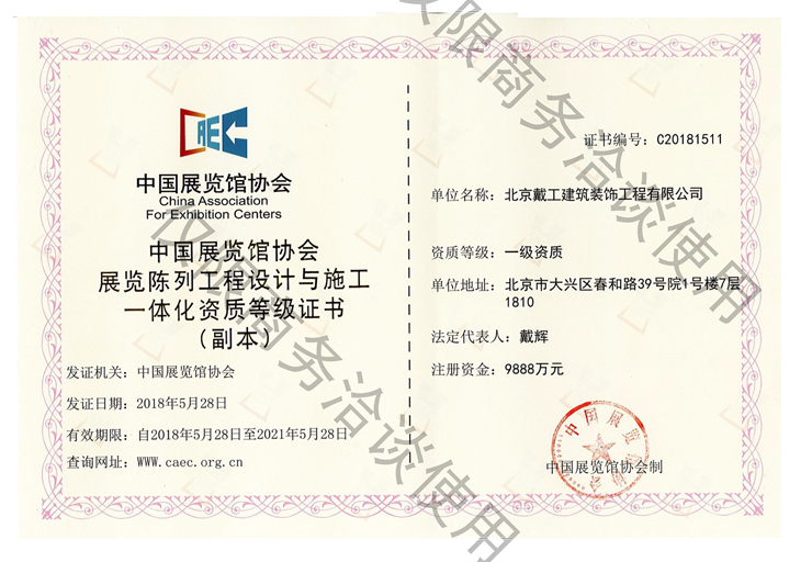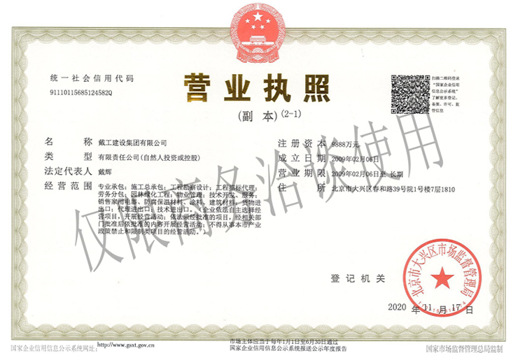 戴工建設(shè)集團(tuán)有限公司,創(chuàng)建于2009年,注冊(cè)資本9888萬元人民幣。公司位于北京市大興區(qū)。具有建委頒發(fā)的建筑裝飾裝修專業(yè)壹級(jí),防水保溫工程專業(yè)壹級(jí),建筑幕墻專業(yè)貳級(jí),消防設(shè)施專業(yè)貳級(jí),電子與智能化專業(yè)貳級(jí),特種工程(結(jié)構(gòu)補(bǔ)強(qiáng))專業(yè)不分等級(jí),建筑機(jī)電安裝專業(yè)貳級(jí),環(huán)保工程專業(yè)貳級(jí),鋼結(jié)構(gòu)專業(yè)貳級(jí),建筑工程總承包貳級(jí),建筑裝飾工程設(shè)計(jì)專項(xiàng)甲級(jí),展覽陳列工程設(shè)計(jì)與施工壹級(jí),展覽展示工程壹級(jí)...更多>>